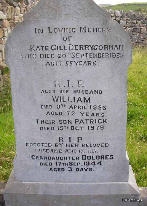 mayo-kilmeena-old1 -- In loving memory of Kate Gill, Derrygorman who died 20th September 1932 aged 55 years. Also her husband William died 6th Apr 1935 aged 73 years. Their son Patrick died 15th Oct. 1979. Erected by her beloved husband and family. Grandaughter Dolores died 17th Sep. 1944 aged 3 days.