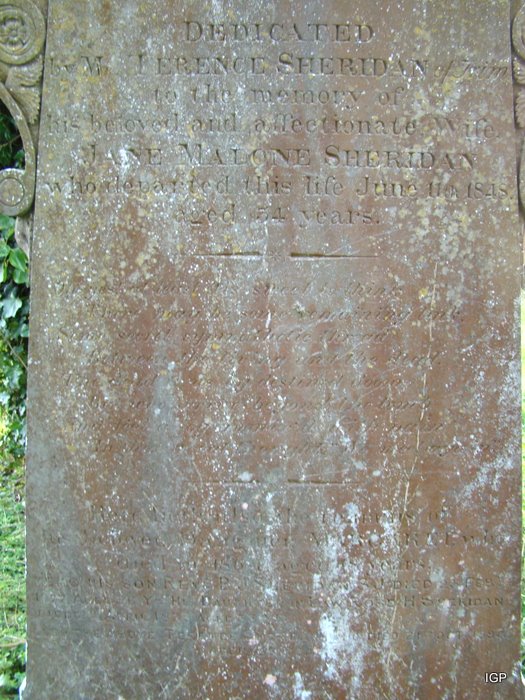 meath-st-michael-rathmolyon-coi -- Dedicated by Mr. Terence Sheridan to the memory of his beloved and affectionate wife Jane Malone Sheridan who departed this life June 11, 1848 aged 54 years. Poem follows on larger picture.